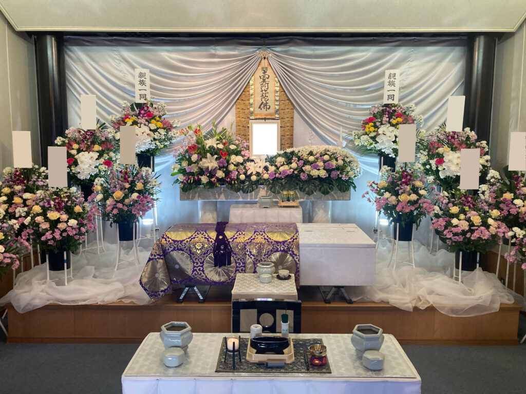 ご家族様より「病院から紹介されたのですが、妻が亡くなったのでお世話をお願いします」とご連絡をいただきました。少しお話を伺うと病院からどちらかの式場に直接のご搬送をご希望でしたので何ヶ所かご提案させていただきました。その中から交通の便なども考慮され西宮市役所近くにございます【楠会館別館】にお決めになりました。早速、寝台自動車を手配し故人様を式場の方にご搬送いたしました。その後、詳しくお話を伺うと仏式で家族葬をなさりたいとのご希望でしたが普段お付き合いされている菩提寺はないとの事でした。そのようなことからご家族様にご本家の宗派をお尋ねしたところ、ご宗派は真宗大谷派とのことでしたので西宮市内にある同宗派のご寺院様を紹介させていただきました。通夜・葬儀はご家族とご親族様のみの少人数での家族葬となりましたが、たくさんのご供花もいただき、華やかな空間でのお見送りとなったことにご家族様にも大変ご満足いただきました。